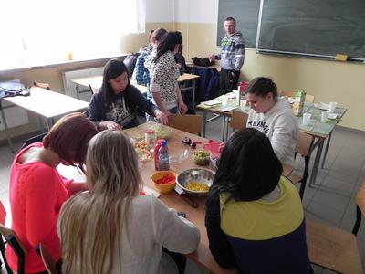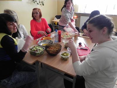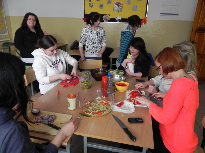 Innym razem klasa zorganizowała wspólne przygotowywanie sałatki wiosennej. Każdy przyniósł jakiś produkt i w ten sposób powstała pyszna finezja, która smakowała także nauczycielomJ