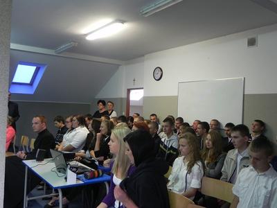 Przedstawiciele Samorządu Uczniowskiego witając nowych uczniów przedstawili prezentację z życia naszej szkoły. Dzięki temu nasi nowi koledzy wiedzą czego mogą się spodziewać w nowej szkole. A oto kilka faktów: