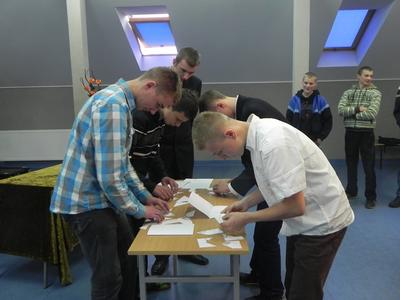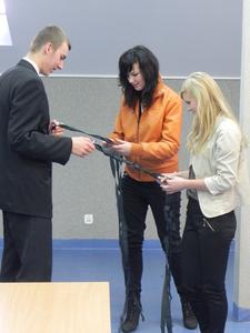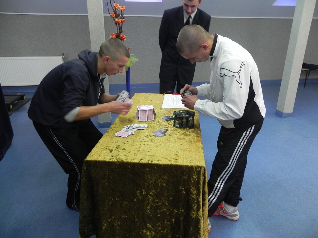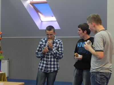 Zanim jednak do tego doszło, każdy został poddany sprawdzianowi z własnego zawodu. Wybór zawodu jakiego dokonali kończąc Gimnazjum nie był łatwy. Na pewno wielokrotnie zastanawiali się, co będą robić w przyszłości. Dlatego starsi koledzy postanowili sprawdzić, jak będą sobie radzić wymyślając zabawne konkurencje. I tak, piekarze i cukiernicy musieli wykazać się umiejętnością jedzenia pączków na czas, mechanicy samochodowi i blacharze ułożyć samochód z rozsypanki obrazkowej, murarze zbudować domek z kart, elektrycy podłączyć żarówkę do baterii za pomocą dwóch drucików, sprzedawcy podliczyć listę zakupów zakupomaniaczki, fryzjerzy zapleść warkocz na czas, a przyszli hydraulicy recytować instrukcję montażu złącza. I choć zadania nie były skomplikowane, to każdy z uczestników starał się jak najlepiej je wykonać.