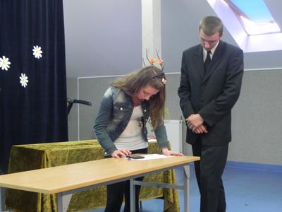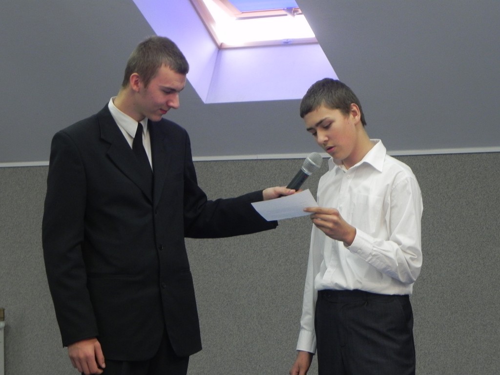 Po pasowaniu uczniowie klasy I odebrali gratulacje i życzenia od swoich starszych kolegów: „Każdy z Was w mniejszym lub większym stopniu przyczyni się do budowania historii szkoły. Czas będzie Wam mijał bardzo szybko w gronie rówieśników, przyjaciół i nauczycieli. Zapewne przeżyjecie tu wiele radosnych przygód. Zapewne też niektóre z waszych pomysłów wyprowadzą z równowagi nawet najbardziej spokojnych i przyjaźnie nastawionych nauczycieli, którzy mimo wszystko będą okazywali Wam wiele zrozumienia i cierpliwości. Jesteśmy przekonani, że zawsze będziecie miło i ciepło mówić o czasie spędzonym w murach Naszej szkoły Wiemy, że ogarnia Was pewien niepokój w związku z nowymi obowiązkami, ale nie martwcie się. wszystko ułoży sie pomyślnie o ile wszyscy wykażemy się cierpliwością, życzliwością i chęcią do nauki i pracy. Tego życzymy Wam wszystkim my – Wasi starsi koledzy.”