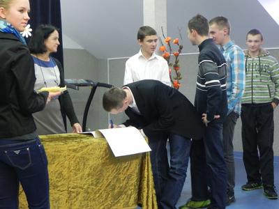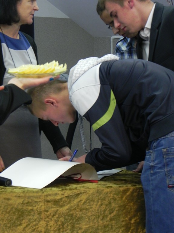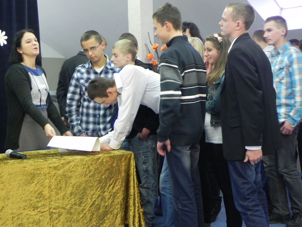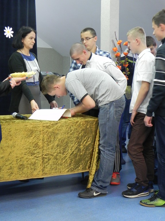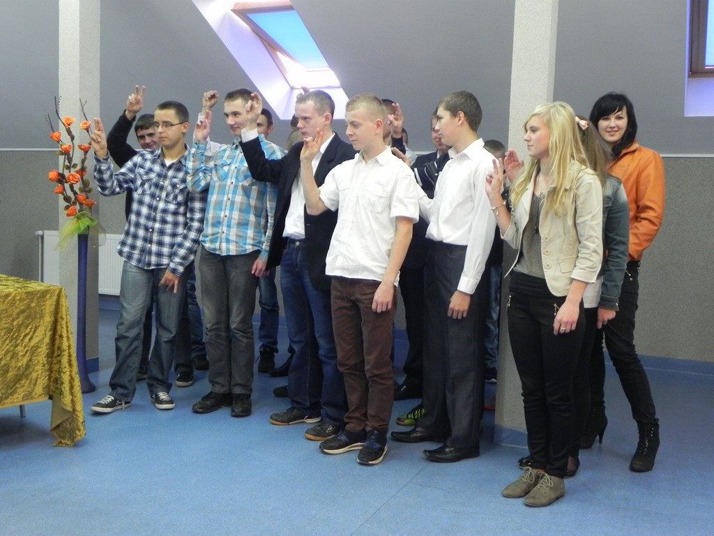 Dzień Edukacji Narodowej był także w naszej szkole okazją do pasowania uczniów klasy I ZSZ. Klasa I ZSZ liczy 27 uczniów. Są wśród nich przyszli sprzedawcy, blacharze, mechanicy pojazdów samochodowych, elektrycy, cukiernicy, fryzjerzy, monterzy sieci, instalacji i urządzeń sanitarnych, piekarze i murarze. W murach naszej szkoły wszyscy spędzą trzy lata. Ślubowanie uczniowie złożyli w obecności Pani Dyrektor, Nauczycieli i społeczności uczniowskiej. Swą gotowość do pracy i nauki potwierdzili własnoręcznym podpisem na akcie ślubowania.